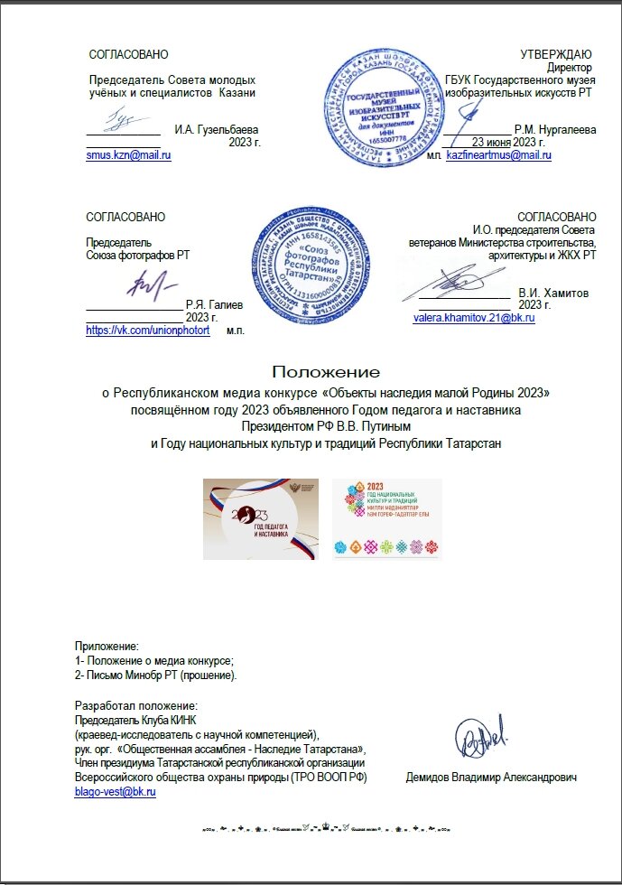 ВКонтакте: https://vk.com/kidsinmus?w=wall-171884279_3638 Минобрнаук РТ рекомендовал Музею ИЗО РТ, утвердившему положение о медиа конкурсе, обратиться в Управление образования г. Казани, тем самым выразив отказ от своих функциональных обязанностей развивать школьные музеи в республике и просвещать образовательные учреждения дополнительного образования историю объектов наследия Татарстана