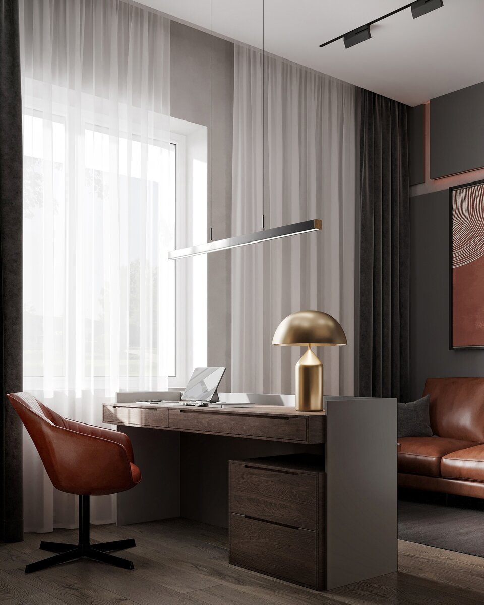 Современное пространство, с кожаным брутальным диваном и креслом, с оттенками темно-серого и акцентом бронзы. Получилась минималистская обстановка. Очень нравится композиция за диваном с красной подсветкой - крутая фишка и не сложная в исполнении!