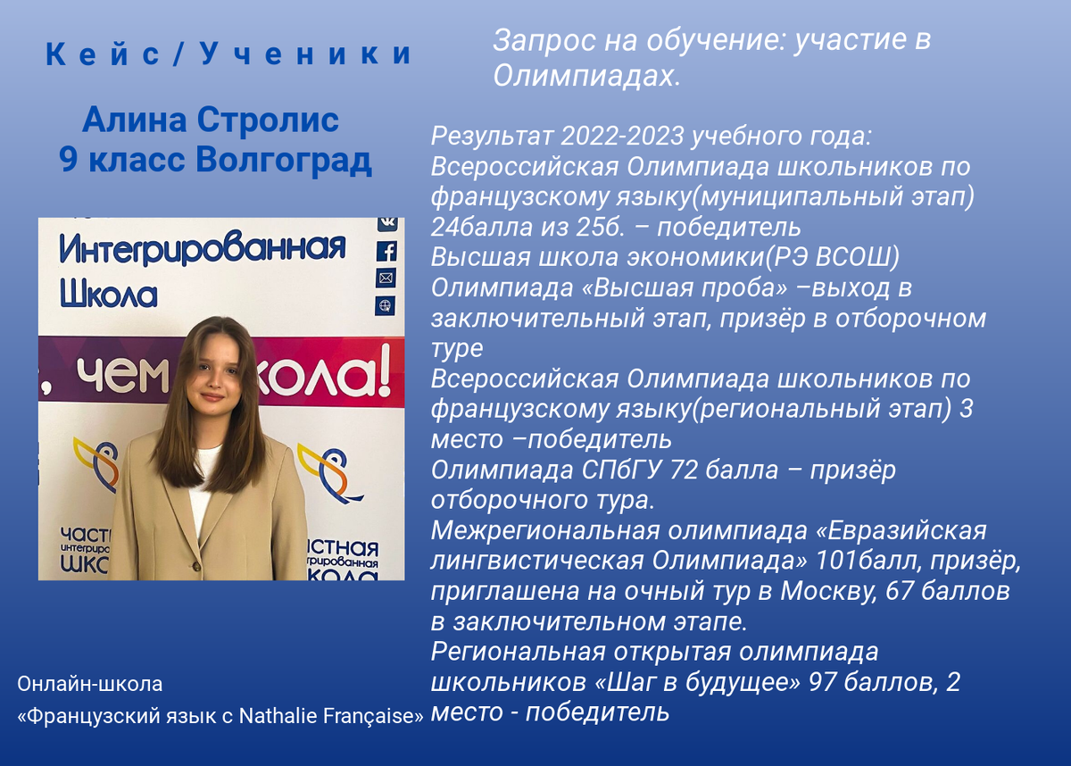 Шесть Олимпиад по французскому языку !!! А в скольких Олимпиадах Алина приняла участие по другим предметам?! И посмотрите, и в каждой, если не победитель, то призёр с высокими баллами!