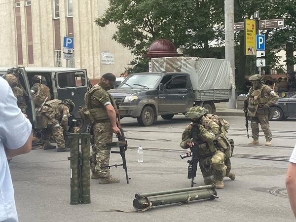Представители ЧВК «Вагнер» просят ростовчан покинуть Буденновский проспект. Люди в камуфляжной форме достают оружие и снаряжение. Зевак, которые бродили по центру города, пытаются разогнать. Если еще утром можно было спокойно гулять по Буденновскому, то уже к 18.00 всех горожан просили уйти в сторону Семашко.