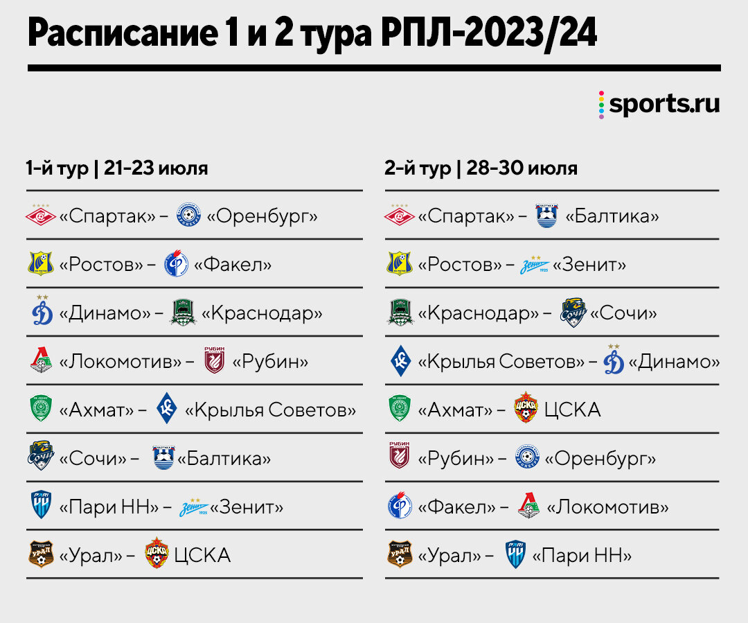 • «Зенит», ЦСКА и «Оренбург» первые два матча проведут на выезде, а «Спартак», «Ахмат» и «Ростов» – дома. «Зенит» сыграет второй тур в гостях (как и затем 7-й и 17-й) «из-за концертных мероприятий в Петербурге и других ограничений со стороны МВД».