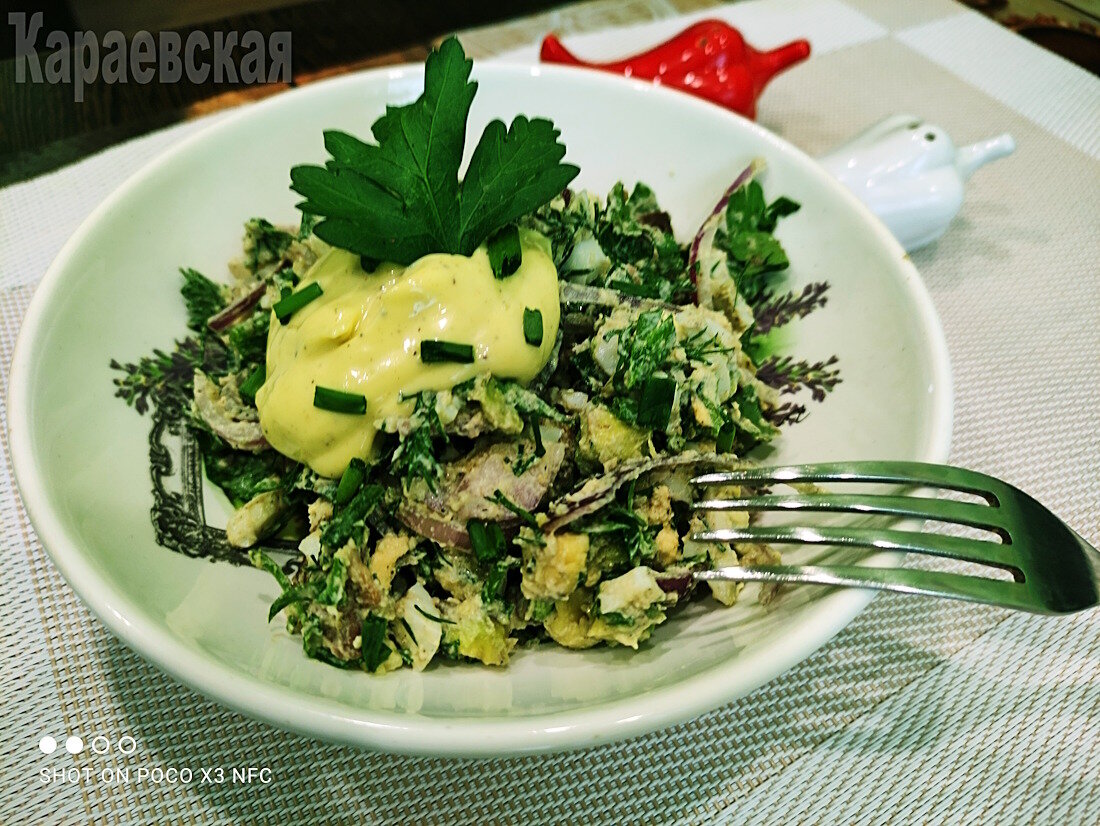 Бекон нарезать на небольшие кусочки и обжарить (без масла). Яйца, авокадо и красный лук нарезать кубиками. Зелень порубить. Все соединить и заправить соусом из майонеза, горчицы и сока лимона.