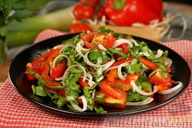 Салат из помидоров, перца и шпината. Греческий салат с креветками. Салат с курицей и яблоками. Овощной салат с колбасой и кукурузой. Cалат с мясными фрикадельками. Традиционный греческий салат из свежих овощей, маслин, салатных листьев и сыра фета можно приготовить в ещё более праздничном и вкусном варианте. Греческий салат с креветками получается более питательным, аппетитным, и ярче выглядит на столе. Салат с копченой курицей, яблоками и овощами – простой рецепт насыщенного блюда. Копченое куриное мясо отлично гармонирует с хрустящим яблоком, огурцами и пекинской капустой, а помидоры обеспечивают сочность. Яркий овощной салат с колбасой, кукурузой и яйцами станет украшением стола и в будни, и в праздничные дни. Благодаря изобилию разноцветных овощей в составе, салат получается очень красочным и сочным. Cалат с мясными фрикадельками, шампиньонами и помидорами черри – интересный, красивый, сытный. Насыщенный кисло-сладкий соус с добавлением горчицы, соевого соуса и кетчупа придаёт сал