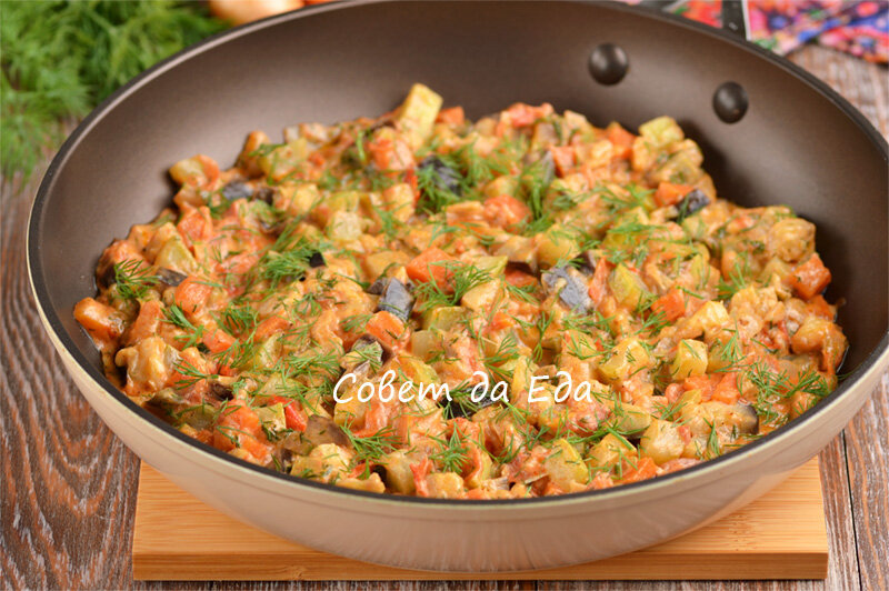 Для меня это лучший рецепт овощного рагу. Овощи при таком способе приготовления остаются целыми и не раскисают. Овощи получаются очень сочными, у них замечательный вкус со сливочными нотками и они очень ароматные. Это универсальный рецепт, так как можно добавлять разные овощи, и все они получаются вкусными. Способ приготовления очень простой. Порции 4-5 Время приготовления 30 минут Ингредиенты Инструкции 1. Репчатый лук не очень мелко нарезаем и отправляем в горячее масло в сковороду. Жарим на сильном огне 2 минуты, помешивая. Он не должен полностью приготовиться. Сковороду крышкой не закрываем. 2. Добавляем в лук кубики моркови и готовим, помешивая, 3 минуты. Морковь станет чуть мягкой. 3. Выкладываем кубики кабачка и баклажана. Огонь убавляем до среднего и жарим овощи 4 минуты. Пока не солим. 4. Овощи остаются целыми и они почти готовы. 5. Добавляем нарезанный помидор и жарим 2 минуты. 6. Дополняем овощи сметаной, немного солим и перемешиваем. Готовим 2-3 минуты. Образовавшаяся жид