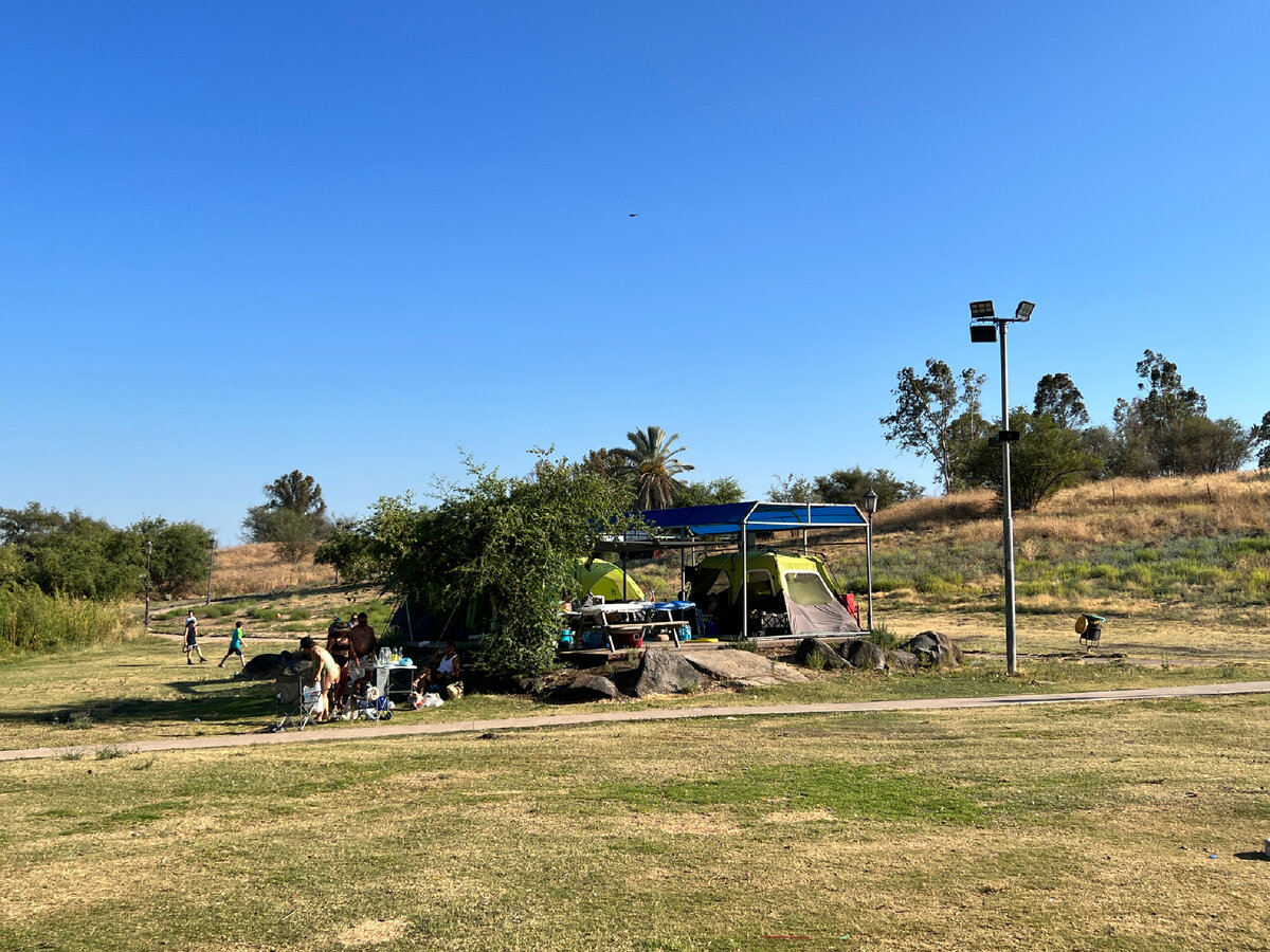 Мы уже давно хотели поехать на озеро Кинерет с палатками и с ночёвкой. Выбор наш пал на пляж Амнон, потому что он был заявлен как оборудованный, тихий, а так же находится вблизи от достопримечательностей, которые нам были интересны. Прежде чем рассказывать дальше, представлюсь для тех, кто ещё меня не знает: меня зовут Таня, на своём канале я пишу о жизни в Израиле, кулинарии, путешествиях и своей семье. У меня есть два сына и три кота. Подписывайтесь, буду рада общению. Посмотрим с вами вместе, что есть на этом пляже. Туалеты и душевые, а так же, такое вот помещение для стирки. Туалеты были грязноватые, конечно. Но их наличие - уже радость. Место для зарядки телефонов, использования электроприборов и приготовления пищи. На пальмах есть крепления для тента и гамака. Вечером любители ловили рыбу. На территории пляжа Амнон стоит заброшенный ресторан. Он закрытый, но по периметру козырька отдыхающие расположились тоже 😅. Прямо такой дикий отдых. Очень пасторальные виды на э