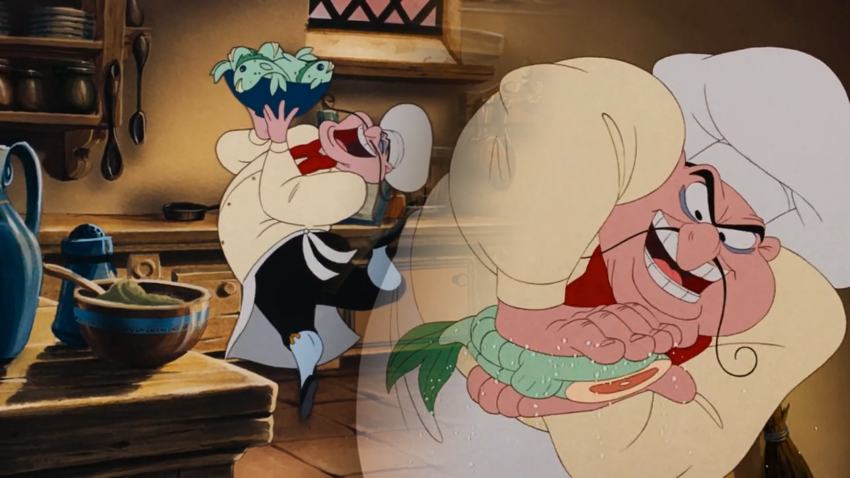 Вот только всё это нам показывают с точки зрения краба Себастьяна, для которого происходящее на кухне буквально выглядит как кровавый слэшер про маньяка, безжалостно расправляющегося с бедными рыбками. С улыбкой на лице и песней на устах. Ужас!