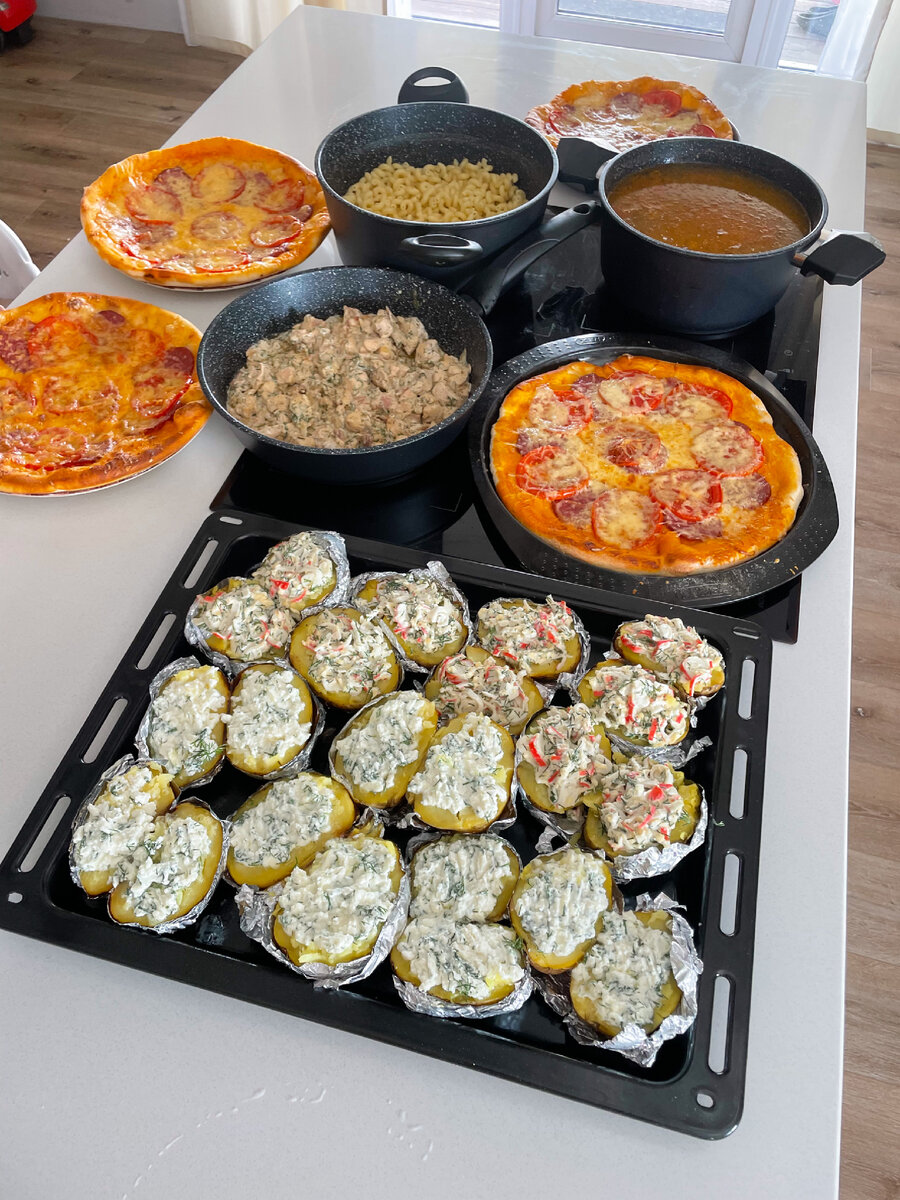 Завтра приезжает старший сын с лагеря, ждём его прям рано утром. Наготовила сегодня сразу на 2 дня, чтоб на готовку уже не отвлекаться. Потратила на всё вот это 2 часа времени. Вот думаю теперь почаще так делать! 2 часа с утра и можно 2 дня заниматься более интересными делами! Что готовила?) На первое - гречневый суп! Мы его очень любим! Рецепт уже давала в этой статье: Сейчас варю его без грибов, чтобы маленький мог тоже поесть. Ему 1 год 2 месяца, уплетает его за обе щеки! 😍 На сегодняшний ужин - крошку-картошку! Сегодня ранее как раз поделилась рецептом! Это оооочень вкусно, попробуйте обязательно! Там минимум вашего участия. Пока картошка запекалась в фольге (1 час) я успела сварить суп, приготовить курицу с беконом, макароны, подготовить начинку для пиццы и начинку для самой картошки) Рецепт курицы с беконом тоже когда-то давно давала, напоминаю: Обожаю и готовлю ее часто! Куриное филе получается сочное, нежное, сливочный соус с беконом прекрасно его добавляют! На гарнир, как выш