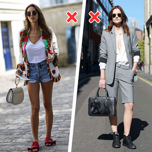 Довольно часто встречаю спортивные короткие шорты и плотный классический жакет. Полный диссонанс! Если вы хотите составить формальный образ, то просто выберите готовый комплект из костюмной ткани. Можно будет носить как вместе, так и по отдельности.