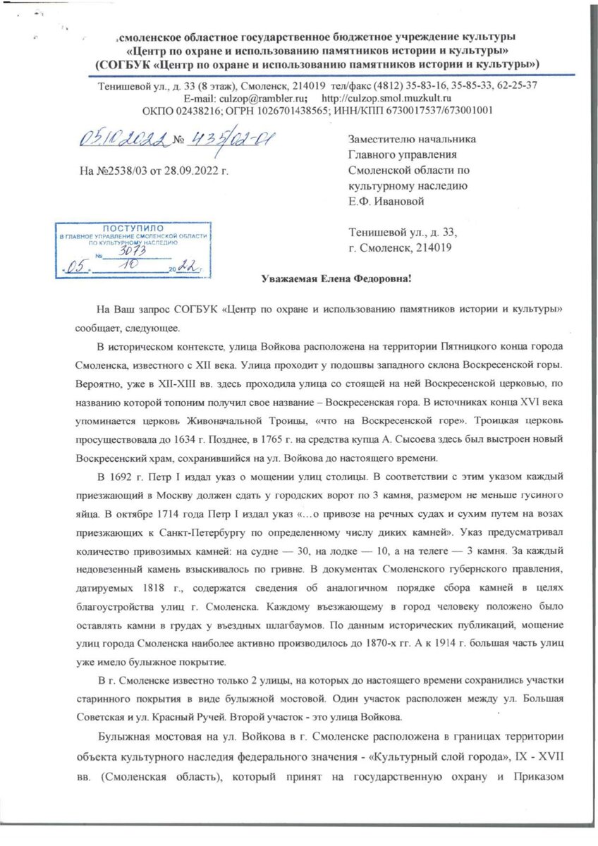Я уже сообщал о том, что начальник главного управления Смоленской области по культурному наследию Толмачев Дмитрий Витальевич ответил отказом на моё заявление о включении булыжной мостовой на улице Войкова в г. Смоленске в реестр объектов культурного наследия.
