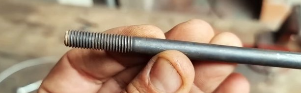 Изготовляем надежную бобышку для стального троса из шпильки диаметром 8 мм Зажимаем болт в тиски, болгаркой отрезаем нужный по длине фрагмент в котором посередине с помощью дрели и сверла выполняем сквозное поперечное отверстие, достаточное для протягивания через него троса. Затем сверлом большего диаметра расширяем первоначальное отверстие на глубину 80-90%. Заводим трос со стороны меньшего отверстия насквозь и сгибаем конец на 180 градусов. Обжимаем его пальцами и пассатижами и проталкиваем в отверстие большего диаметра. Зажимаем бобышку в тиски и натягиваем трос руками, чтобы утолщенная его часть глубже и плотнее вошла в большее отверстие бобышки. Оставшийся утолщенный изгиб троса расплющиваем молотком и запаиваем припоем, который не только консервирует конец троса, но и дополнительно укрепляет соединение, заполняя пустоты внутри отверстия и между отдельными проволочками из которых сплетен трос. Изготавливаем затягивающую петлю на тросе и надежно крепим конец с помощью заклепки Есл