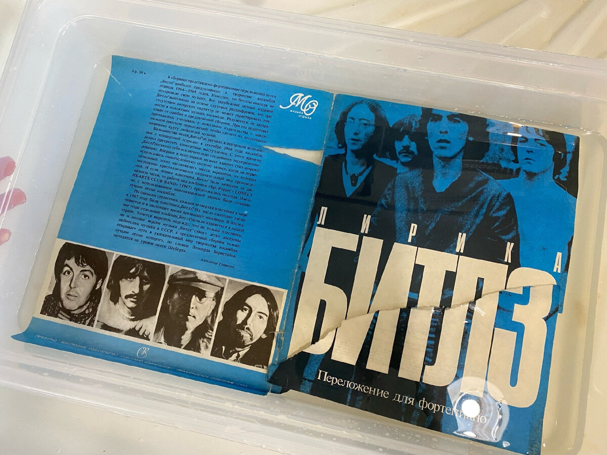 Клеевое покрытие скотча может быть опасно для химического состава бумаги, его чрезвычайно сложно удалить с поверхности документа, да и выглядит подобный ремонт неэстетично. Поэтому нам вдвойне приятно, когда к нам в Центр обращаются с просьбой о бережной, а главное, безопасной реставрации документов. Данный сборник фортепианных переложений песен «Битлз» перед началом реставрации имел большой разрыв передней обложки и небольшую утрату с обратной стороны. Мы отсоединили обложку от однотетрадного блока, убедились в отсутствии водорастворимых печатей и записей на ее поверхности и приступили к промывке в дистиллированной воде. Промывка позволяет восстановить кислотно-щелочной баланс бумаги, уберечь ее от