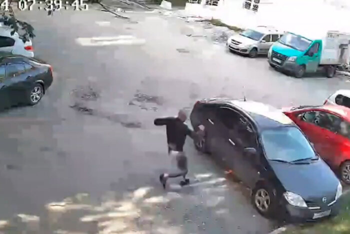 Неадекватный поступок зафиксировали камеры наблюдения. На кадрах видно, как разъяренный без всяких причин ногой выбивает стекло первой попавшейся машины, припаркованной с краю.