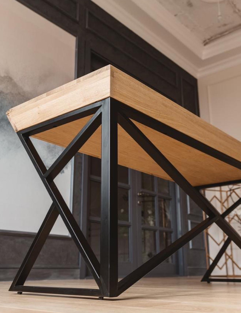 Нестандартный рабочий стол с двумя выдвижными ящиками и геометрическим металлическим подстольем 💣 Размер: 1200x600x750 Материал столешницы: шпон дуба Цена: 60 000₽ Цена без скидки: 135 000₽ 🚗 Самовывоз