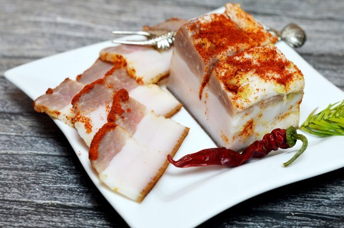 Сало – домашний деликатес с длительным сроком хранения. Сейчас сало использую преимущественно в качестве перекусов. Пара ломтиков хлеба с тонкими слайсами соленого сала – и силы моментально восстанавливаются. Сало воздействует на организм подобно энергетическим напиткам: усталость исчезает, легко переносятся физические нагрузки. Острые приправы необходимы салу, они помогают жирному продукту хорошо усваиваться. Кроме того, паприка, чеснок и красный перец способствуют укреплению иммунитета, что особенно актуально в холодное время года. Предложенный сухой посол имеет некоторые особенности: сало находится в посуде, затянутой пищевой пленой. Следовательно, на дне емкости появится рассол, а просолившееся сало будет очень мягким, как раз подходящим для бутербродов.