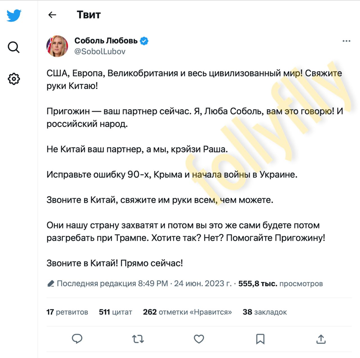 Кажется, белая полярная лисичка и правда пришла к нашей Любе. Особенно умилило вот это: "Я и российский народ". Ну не прелесть ли? Государство - это я, ага. Лично я как неотъемлемая часть российского народа Любу говорить от моего имени не уполномочивала. Не просила, не делегировала! И Китай прошу оставить в покое - на данном отрезке истории он нам скорее помогает, чем мешает. Не надо ничего ему связывать, пусть он свободно шевелит как руками, так и ногами. Если вам прямо-таки необходимо кого-то зафиксировать и сильно чешутся оконечности, обратите внимание непосредственно на Любу. У меня уже давно такое впечатление, что ей необходима медицинская помощь - и это не только капельницы. И чем дальше, тем большее я убеждаюсь в своей правоте. Все-таки оппозиционная деятельность до добра зачастую не доводит. Или сидишь, или пьешь, или массы пугаешь. Ну что это за деятельность такая? А созидание где? Бедная женщина... А в Китай позвонил кто-нибудь?