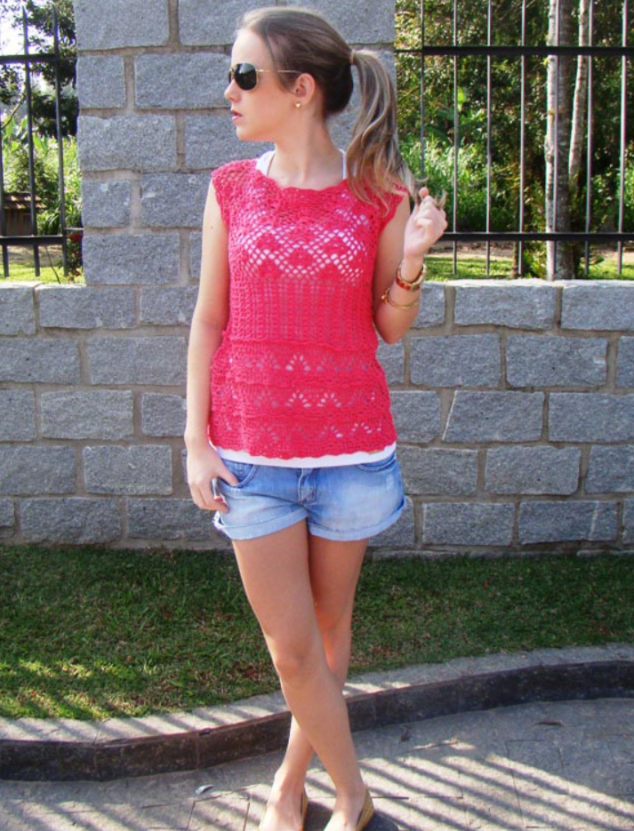 Коллекцию летних топов, связанных спицами, мы пополнили здесь: >>>>>>>>>>>>>>> А теперь летние модели легких маечек, связанных крючком. 1. Маечка красного цвета. Выполнена тремя видами ажурных узоров. Ананасный узор и ракушки дополнены сетчатым вязанием. 2. Интересная идея летней кофточки. За счет неполных боковых швов образуются проймы и оборки из вязаного полотна вдоль швов. Свободная кофточка смотрится красиво и по-летнему комфортна. 3. Укороченный топ с отделкой бахромой. Простой рисунок вязки ускоряет работу. Красивая отделка и тонкие бретели - такой топ создан на самое жаркое время. 4. Летняя майка синего цвета. Вяжется простым узором. В качестве отделки в нижней части вывязана небольшая кайма. Майка имеет укороченную длину. 5. И снова насыщенный цвет привлекает внимание к этой модели. Крупные ракушки - основной элемент кокетки и коротких цельновязанных рукавов этой малиновой маечки. Нижняя часть из красивых вертикальных дорожек. 6. Топ с цветочными мотивами. Несколько рядов кра
