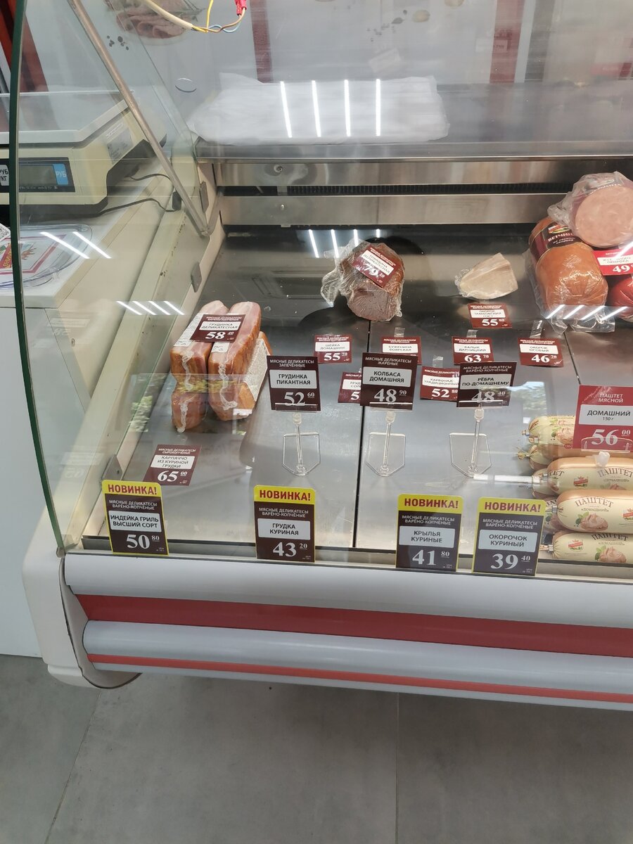 Из нового: куриные крылья за 418 рублей/кг, окорочок с ценой 394/кг. На дальнем плане ценники такого же цвета, отличаются от обычных красных, но уже нет надписи "новинка", поэтому не знаю только они появились или уже были, на всякий случай перечислю и ассортимент второго ряда: домашняя колбаса жареная (489 рублей за кг), ребра по-домашнему (варен-копченые; 484/кг). Самое дорогое, что увидела, это карпаччо куриное сырокопченое, стоит аж 650 рублей/кг, правда и его разобрали уже.