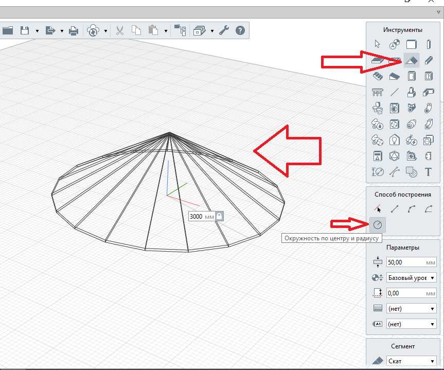 При работе над информационной моделью (ИМ) в программе Renga бывает возникает необходимость в создании крыши. Обычно, построение модели крыши в ренге не вызывает вопросов, но как же постоить крышу в ренге с точными параметрами в виде конуса (конусообразная крыша, коническая крыша)? Например, нужно построить крышу конической формы с радиусом основания R=3 метра и высотой, по внутренней части, равной h=4,5 метра. (Вы читаете статью про построение конической крыши в программе renga, ниже будет ссылка на видеодемонстрацию такого построения). Запускаю программу Renga и начинаю по умолчанию брать инструмент "Крыша" - способ построения "Окружность по центру и радиусу" и строю коническую крышу: ставлю центр окружности (основание) крыши в начале координат и отводя в сторону вбиваю 3 000 и фиксирую. К сожалению, такой подход не дает коническую крышу по нужным параметрам, так как высота крыши получается не 4,5 метра. Нужно обратить внимание на самое нижнее окно под названием "Сегмент" - там мы ув