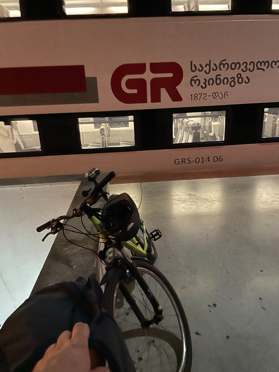 Поезд отправляется из Батуми в 00:45. Поэтому выехал пораньше, покатался по ночному городу. И лишь за полночь приехал на вокзал. По правилам велосипед можно провозить разобранным и в чехле.