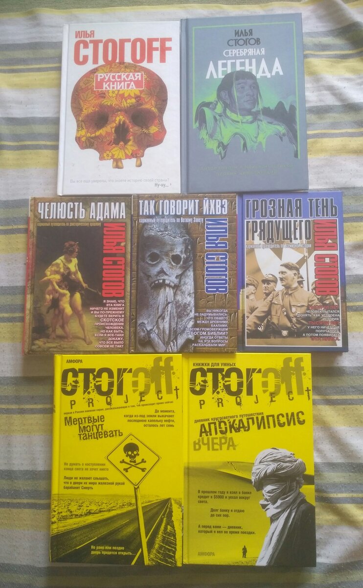 ПыСы. У Ильи Стогова есть не очень приятная особенность. Он переиздаёт свои книги. Казалось бы это нормально для автора. Но часто одна и та же книга выходит под разными названиями (к примеру, «Грозная тень грядущего» в 2001 г. выходила под названием «Пепел империй. В поисках законов истории», а в 2008 г. – «Как устроена всемирная история»). Или делается компиляция из отдельных моментов нескольких книг, в которых дописывается несколько глав и издаётся как совсем новое произведение. Или при переиздании меняется порядок глав, которые дополняются новыми вставками (так произошло с «Апокалипсис вчера»). Сам же автор утверждает, что это «самодеятельность» издательств, но думаю, что определенные согласования с ним все-таки происходят.