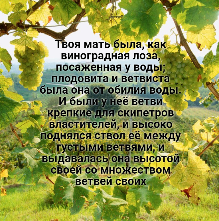 “Твоя мать была, как виноградная лоза, посаженная у воды; плодовита и ветвиста была она от обилия воды. И были у неё ветви крепкие для скипетров властителей, и высоко поднялся ствол её между густыми ветвями, и выдавалась она высотой своей со множеством ветвей своих. Но в гневе вырвана, брошена на землю, и восточный ветер иссушил плод её; отторжены и иссохли крепкие ветви её, огонь пожрал их. А теперь она пересажена в пустыню, в землю сухую и жаждущую. И вышел огонь из ствола ветвей её, пожрал плоды её, и не осталось на ней ветвей крепких для скипетра властителя. Это плачевная песнь, и останется для плача” (Иез. 19:10-14).