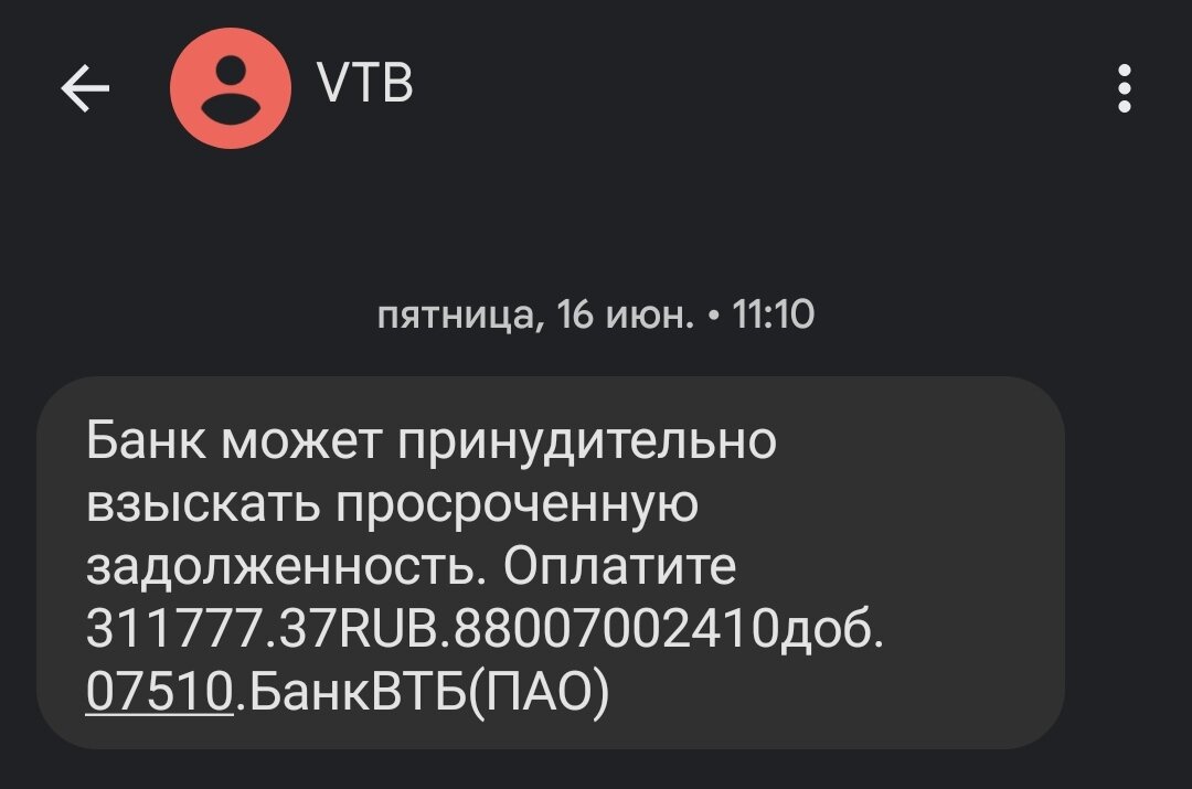Первый банк, не получивший регулярный платеж, был как раз ВТБ. Это была кредитка на 200 тысяч. С наступлением проблем кредитки я отмел сразу. Несмотря на величину банка, за это время долг вырос чуть больше, чем в 1,5 раза - до 311 тысяч рублей. Как в каком то МФО...