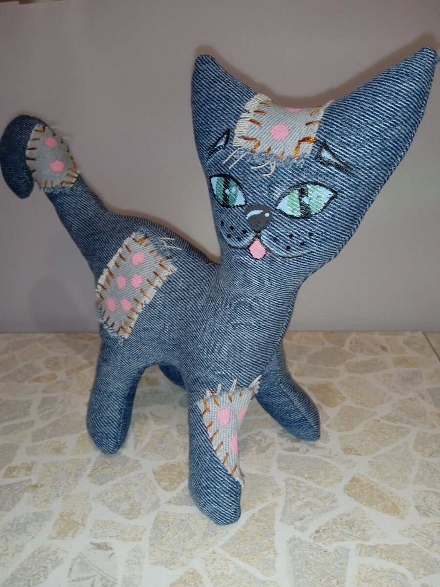 Давно не шила игрушки. Поэтому сегодня сшила джинсового кота. Сначала сделала выкройку. Основная деталь - две штуки, внутренняя часть ног - одна штука. На подходящем по размеру куске джинсы, сложенном лицом внутрь, обвела выкройку. Сделала припуски на швы около 1 см. Отметила, где будет вшиваться внутренняя часть лап. Соединила строчкой верхнюю часть кота до отметок. Пришила внутреннюю часть лап поочередно, начиная строчку от отметки. На одной из лап оставила дыру для выворачивания. Швы срезала на 0,5 см. от строчки и надсекла во всех выемках. Вывернула кота. При выворачивании случайно прорвала лапу и хвост. Но это исправила с помощью заплат. Именно поэтому кот получился таким, каким получился. Набила кота обрезками синтепона, зашила дыру для выворачивания потайными стежками. Прорванные дыры пришлось зашивать через край. Чтобы избежать таких неприятностей, лучше шить из тянущейся джинсы, но у меня была обычная. Чтобы скрыть дефекты, сделала заплаты из джинсы другого цвета. На заплат