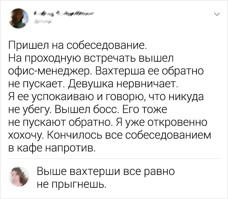 Собеседование часто становится серьезным испытанием для соискателя. В нем проверяется стрессоустойчивость, задаются неуместные вопросы, которые не имеют отношения к должности, проводятся психологические тесты и появляются другие непредсказуемые ситуации, на которые трудно заранее подготовиться. В свою очередь, рекрутеры также часто оказываются в ситуациях, когда собеседование выходит из-под контроля и напоминает анекдот. Каждое собеседование является ценным опытом, а порой историей, которую можно рассказать друзьям. Реальные истории от кадровиков и соискателей убедительно доказывают это. В конце статьи вы найдете бонус в виде рекомендации о том, какой вопрос стоит задать каждому кандидату. Одно из моих любимых собеседований было таким: кандидатка рассказывала почти 20 минут, а затем достала свой телефон и начала показывать фотографии щуки, говоря: "Посмотрите, какая рыба! Я сама ее поймала, она весит 7 килограммов!" Конечно, вакансия никак не связана с рыбалкой. Когда я проводила собе