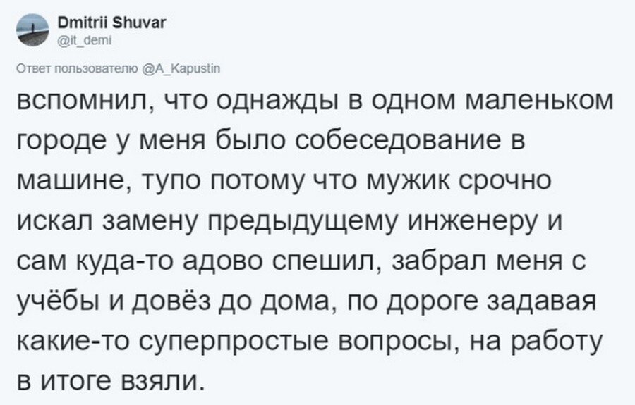 Работа у меня и так хорошая, но в поисках приключений и дополнительного заработка занесло меня тут нечаянно на «собеседование» в страховую компанию. Дама, проводившая это самое собеседование, старательно пела о том какая я умная, образованная и вообще молодец. А я не могу так прям сходу послать человека, даже если мне он неинтересен и очевидно бесполезен. Но когда она поняла что от меня ей ждать нечего, то резко свое мнение обо мне поменяла в худшую сторону, и не постеснялась столь же многословно высказаться. У меня на собеседовании спросили мой знак зодиака. Честно ответил, что лев. После этого мне сказали, что я им, к сожалению, не подхожу. По делу вообще ничего не спрашивали. Пришла на собеседование в бухгалтерию одной фирмы. Поговорили с кадровиком, вроде все хорошо. Второй этап — общение с директором. Директор несколько раз заострял внимание в своей речи, что они тут не просто коллектив, они — семья, поэтому должны все знать друг о друге. Вот, например, секретарша взяла кредит, ч