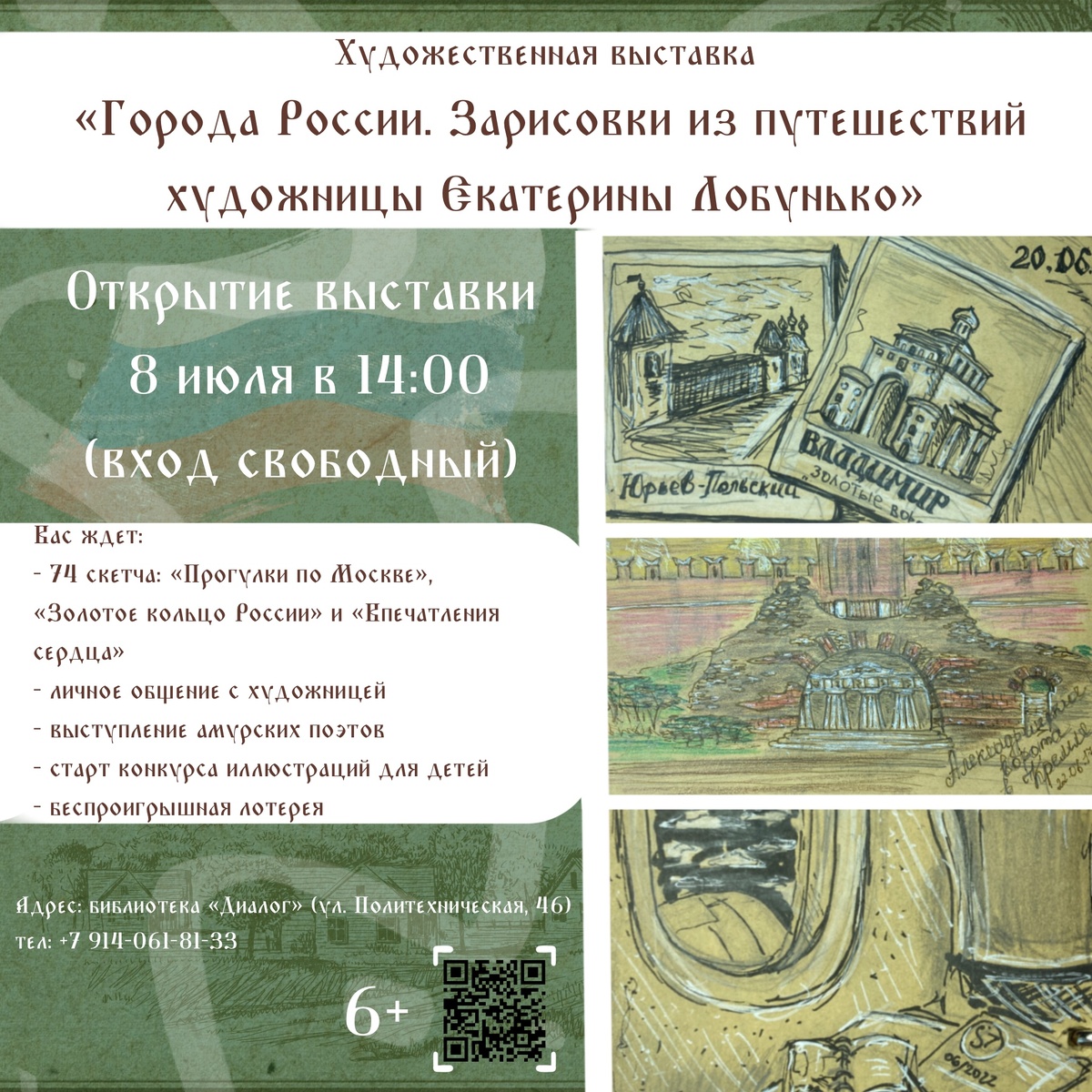С 2015 года в теплые месяцы Катя – художница из г. Благовещенска - путешествует по городам России и делает скетчи полюбившихся сердцу мест. Люди, вкусняшки, памятники архитектуры, самолетные зарисовки живут в её дорожных блокнотах, согревают воспоминаниями в зимние вечера. Интересно наблюдать, как легкие карандашные скетчи впоследствии обретают цвет и становятся настоящими произведениями искусства!!! Открытие выставки состоится 8 июля в 14-00 в библиотеке «Диалог» (ул. Политехническая, 46)