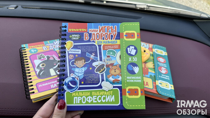 Обзор мини-игр от Bondibon Когда нам предстоит дальний путь, я использую все родительские чит-коды, чтобы дорога стала для всех приятным временем. Нам с мужем - кофе, снеки и разговоры, а детям - вкусняшки и новые развлечения. Книжки-малышки сделаны из плотного картона, ярко раскрашены и удобного размера для детских ручек. Возраст 3+ и 4+, но также они заинтересуют и младших школьников. Приехали упакованные в пакетик на липучке. «Времена года» Интерактивная книжка с мягким персонажем. Ребёнок может сам играть утёнком, или родитель может читать от его лица. Нам предстоит прогулка по ферме в разное время года. На каждом развороте есть темы для обсуждения и вопросы малышу. А также небольшие задания: посчитать снеговиков, птичек, найти лягушонка. Если в машине есть читающий ребёнок, он может сам поразвлекаться. «Малыши выбирают профессии» Классический набор профессий, которые изучает каждый ребёнок - врач, повар, полицейский, моряк, космонавт, строитель. Когда, интересно, выпустят книжки с