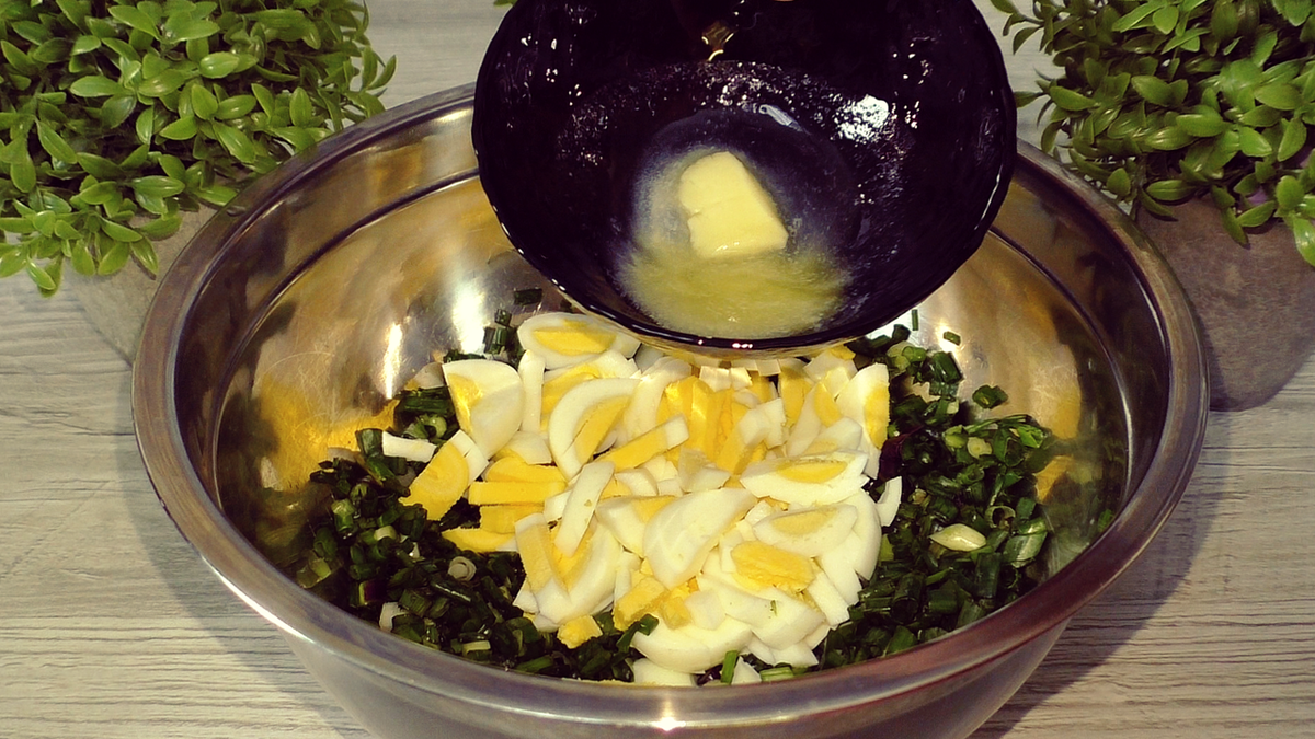 Добавляю яйца, кусочек растопленного сливочного масла, перемешиваю. Начинка должна быть слегка пересолена, тогда у пирога будет сбалансированный вкус. Готовлю заливное тесто.