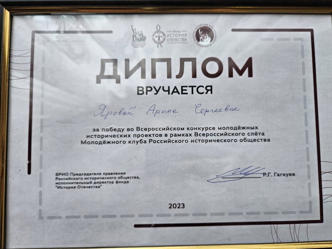 Арина Ярова победила в конкурсе проектов. Она представляла исторический проект «Истина». При поддержке Молодежного клуба Российского исторического общества проект будет реализован.