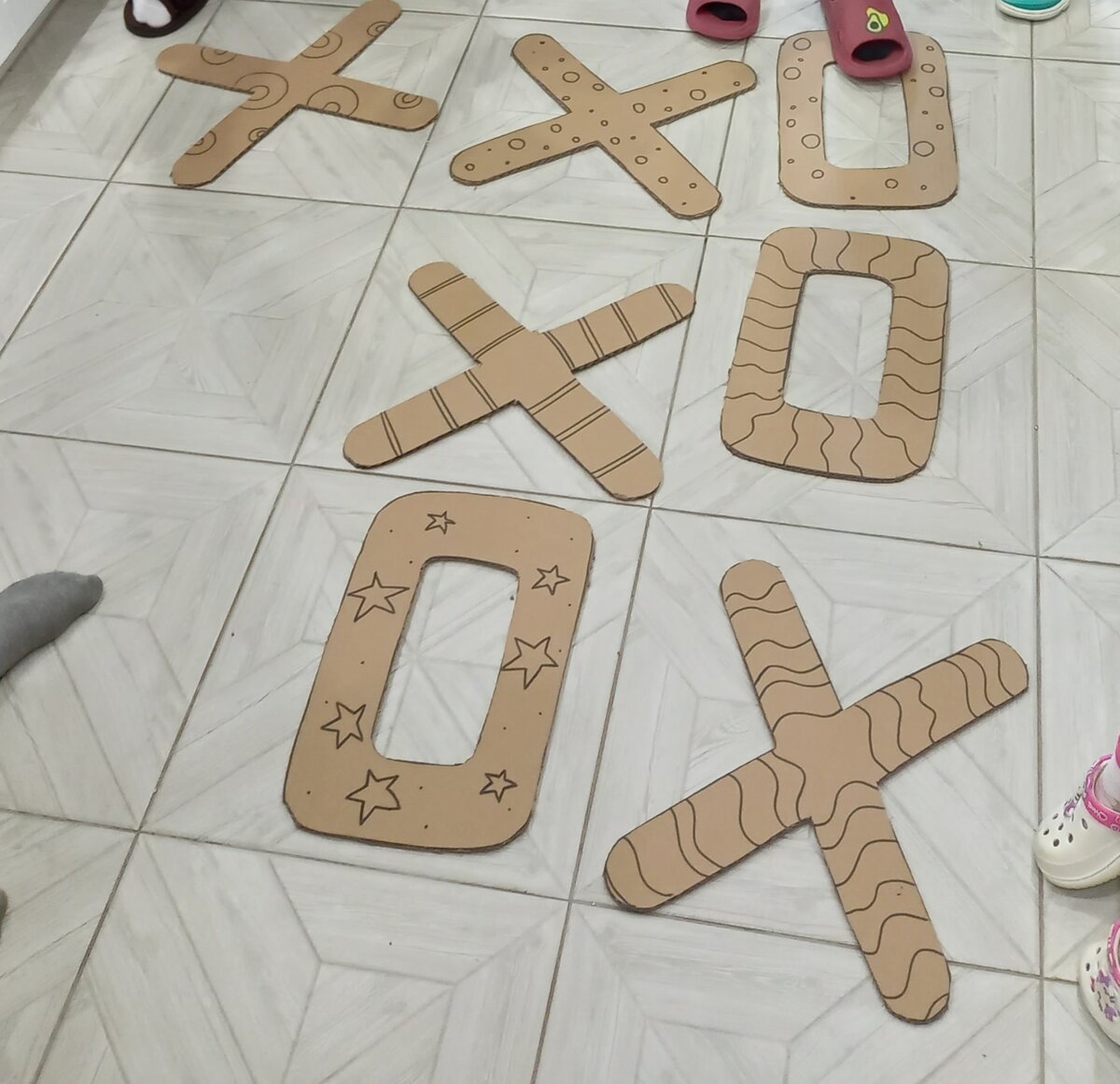 Добрый день дорогие друзья, сегодня я расскажу вам как используя пустую коробку, фломастер и ножницы сделать из старой идеи новую версию увлекательной игры! Любая настольная игра приобретает новые эмоции увеличиваясь в размере:))) Будь то знакомая всем "Башня" или "морской бой", а также "Крестики-нолики". Особенно ее удобно использовать если у вас позволяет пространство и пол выложен большими квадратными плитками. Но можно сделать разметку поля и на любом покрытии разноцветным скотчем. И так приступим. Для реализации данной идеи нам потребуется: Для начала нужно подготовить шаблон крестика и нолика необходимого размера. Это можно сделать при помощи сложения листа кальки или газеты, для того чтобы изображение получилось симметричным. Затем обводим полученные шаблоны на картоне карандашом или фломастером. Таким образом вырезаем по 5 крестиком и по 5 ноликов (на практике хватает и по 4 шт.) Ну и для того чтобы наши заготовки выглядели по интереснее, можно их украсить, я выбрала просто