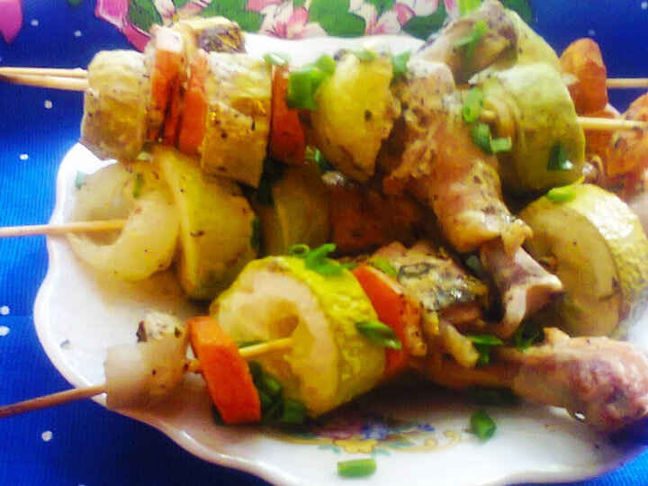 4 голени, по 2 небольших луковицы, моркови, кабачка. 4 деревянные шпажки. Голени моем, овощи чистим, режем кружочками. Шпажки вымачиваем в воде минут 20. Мясо и овощи маринуем в смеси специй, приправ, лимонного сока, масла. Нанизываем овощи и голени на шпажки. Помещаем на противень, на смазанную маслом фольгу. Прикрываем сверху фольгой. Запекаем минут 30-35, снимаем фольгу, чтобы всё зарумянилось, и доводим до готовности. От наших друзей: Валентин Смирнитский, актёр, Народный артист России, на Радио Медиаметрикс Больше общения и рецептов - в группе "Рецепты для диабетиков" в ВКонтакте! Рецепт на странице Автор рецепта – Людмила Гурова