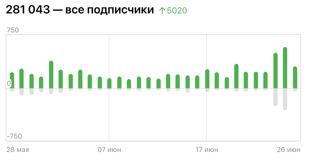 Я считаю, это прекрасный показатель того, как настроена наше общество. Поддерживает ли оно мятежников или нет. Понятное дело, что социальные сети устроены так, что у какого-либо автора аудитория более-менее однородна и потому ведет себя более-менее одинаково. Ну, то есть, если я напишу, что иноагент Навальный – красавчик, то у меня почти не будет лайков. А если то же самое напишет какая-нибудь иноагент Люба Соболь, то её подписчики прям оценят. Ну, просто у нас с ней аудитория абсолютно разная. И тем не менее, несостоявшийся мятеж тем и примечателен, что он был рассчитан на патриотическую часть общества, коей моя аудитория в основном и является. Так что количество отписок именно на моем канале – весьма любопытно. Итак, в Дзене автору доступна статистика подписчиков, которая выглядит так: В обычные дни, когда я также много пишу, но пишу не про политику, а просто про географию и историю, на меня в среднем подписывается 400 человек в сутки, а отписывается около 100 (итого, прирост 300 чел