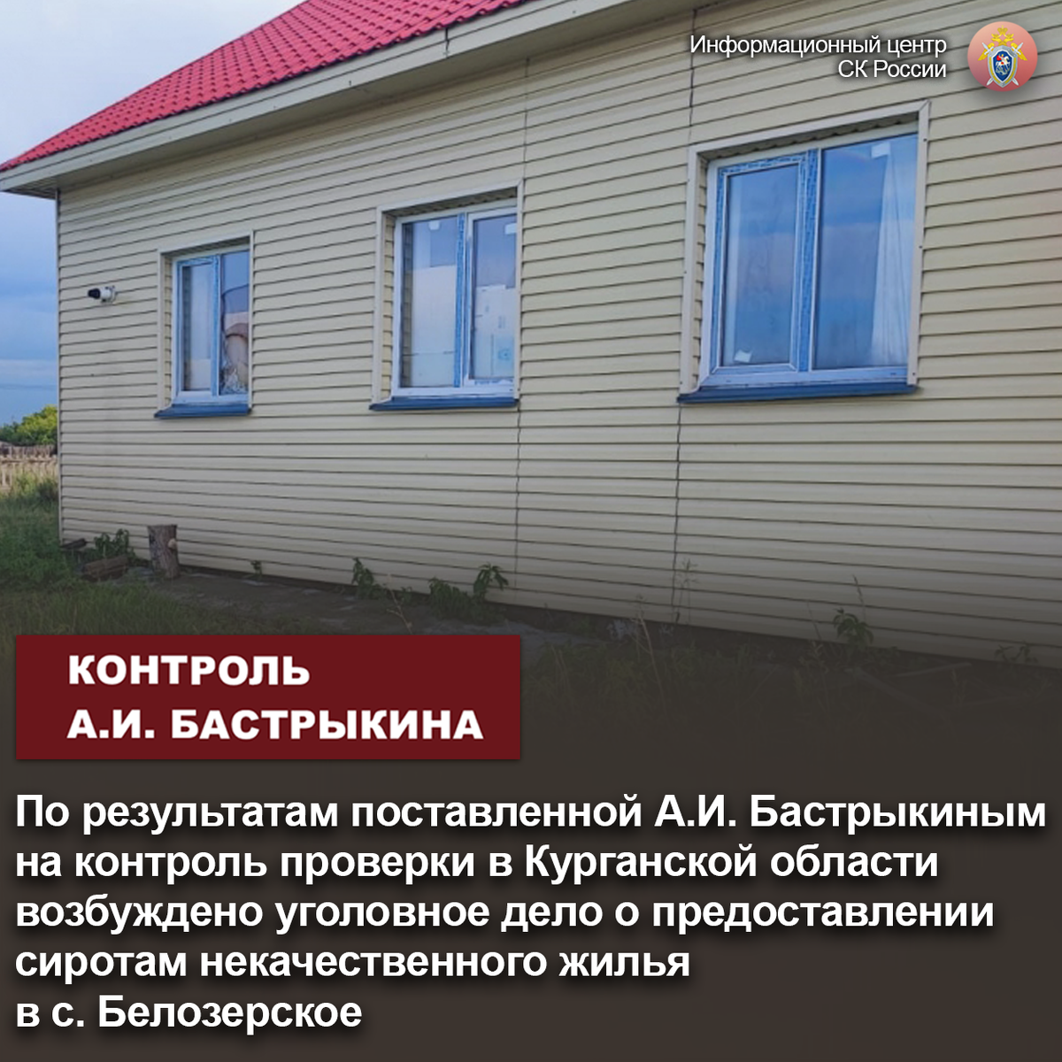 В социальной сети сообщалось о предоставлении сиротам в селе Белозерское Курганской области некачественного жилья. В доме имеются проблемы с отоплением, в связи с чем в зимний период времени температурный режим не соответствует норме. Указывается на разрушение фундамента и стен строения, наличие плесени в жилых помещениях и грибка в подвалах. Обращения в местную администрацию результатов не принесли.