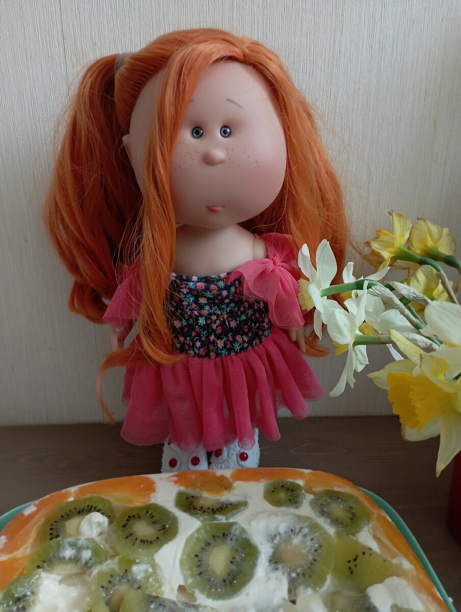 Вместе с Марусей сготовим эффектный, яркий и аппетитный десерт. Приготовим 2 мандарина, 3 киви. Почистим фрукты. Забыли про грушу. Берем 1 кг творога. Переложим его в кастрюлю. Добавим 300-350 гр сметаны. Взбиваем погружным блендером до однородной массы. 30 гр желатина заливаем холодной водой, он должен набухнуть в течение 10 мин. В сметанно-творожную массу добавляем 1 стакан сахара (250 гр), оставляем на 10 мин. до полного растворения. Желатин нагреваем на медленном огне до растворения, не доводя до кипения. Даем желатину немного остыть. Застилаем пищевой пленкой форму для легкого извлечения. Нарезаем фрукты тонкими ломтиками. Обкладываем дно и стенки формы фруктами, тщательно прижимая к стенкам. Сметанную массу соединяем с немного остывшим желатином, перемешиваем. Аккуратно вливаем, чтоб фрукты не всплыли. Ставим форму в холодильник на 10 мин. для схватывания желе. Затем достаем и раскладываем оставшиеся фрукты. Ставим в холодильник на 2-3ч. Я убираю десерт в холодильник на ноч