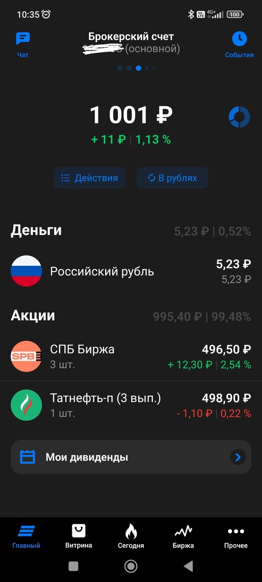 Друзья, всем привет. Сегодня я подведу итоги второй недели инвестирования в акции РФ. На 26.06.2023 г. Мой, пока ещё микропортфель, состоит из 3 шт акций СПБ биржи и одной акции Татнефть-п. По итогу двух недель акции СПБ биржи прибавили +2, 54% или +12, 30 рублей. А акции Татнефти-п ушли в минус -0, 22% или -2, 10 рублей. На данный момент весь портфель акций прибавил 1,13% или 11 рублей. 5,23 рублей остаток денежных средств на брокерском счёте, который перейдёт на следующую покупку. Всё публикации автора не являются инвестиционной рекомендацией и публикуются исключительно в информационных и развлекательных целях. Всем спасибо, кто дочитал статью. Жду Ваших комментариев. Подписывайтесь на канал!