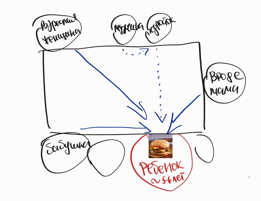 Повседневные наблюдения Наша профессия становится нашей частью. Непроизвольно, но все же мы смотрим на мир через призму своего опыта и знаний. Вот и мой третий глаз фоново наблюдает за детско-родительскими отношениями вокруг меня. Поэтому я решила ввести рубрику "Повседневные наблюдения". Думаю, это будет интересно для совместных обсуждений с вами. А теперь возвращаемся к истории. Ужин ресторане. За соседним столиком большая семья, около 8 человек. Праздновали день рождение старшего члены семьи. Я была очень голодна и с нетерпением ждала свой заказ. И тут официант несёт большой бургер. Не мой. Для мальчика за соседний стол. Для наглядности покажу схематично как это выглядело. Как только официант поставил бургер на стол, сразу просыпался ряд ...хм.. пытаюсь подобрать подходящее слово.. лучше оставлю это для вас. Я лишь опишу в действиях: Все эти действия произошли меньше чем за минуту А подросток просто отсел назад и пристально смотрел на этого мальчика с бургером. В фокусе вниман