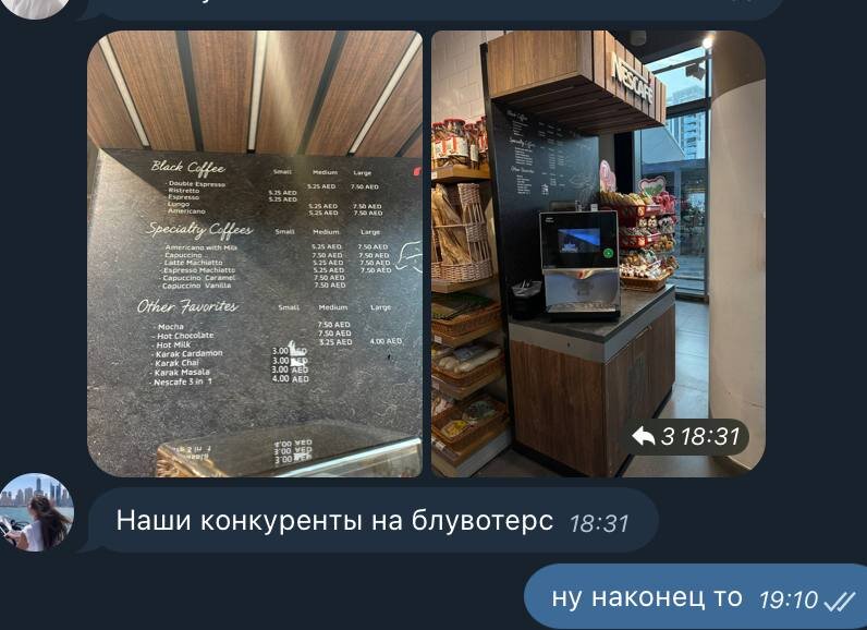 Одна из задач наших локальных маркетологов, что в Дубае, что в Грузии — следить за рынком и регулярно актуализировать наши знания о конкурентах. Вчера в нашем чатике появилось сообщение о том, что на рынке новый игрок. Но кажется, он откуда-то из прошлого. Мы тоже в Дубай сначала заходили через низкие цены, локации в супермаркетах, но все равно не позволяли себе быть такими «топорными». Распишу подробно: 🟣Локация: продуктовый магазин на «Блувотерс». Мы уже пробовали такой тип локаций и поняли, что это не то место, где можно получить много продаж и развивать кофейню. Опустим этот момент, так как позже мы узнали, что кофейню поставили владельцы магазина. То есть, они захотели продавать кофе и заключили контракт с большой компанией — Nestle/Nescafe. Но поставить кофейню рядом с колонной, которая перекрывает доступ … 🤦🏻 🟣Выбор бренда. В кофемашину засыпано зерно, но Nescafe вообще не ассоциируется с хорошим зерновым кофе, а в меню можно найти 3в1 🫠 Такой кофе дешевле, чем у нас, но эт