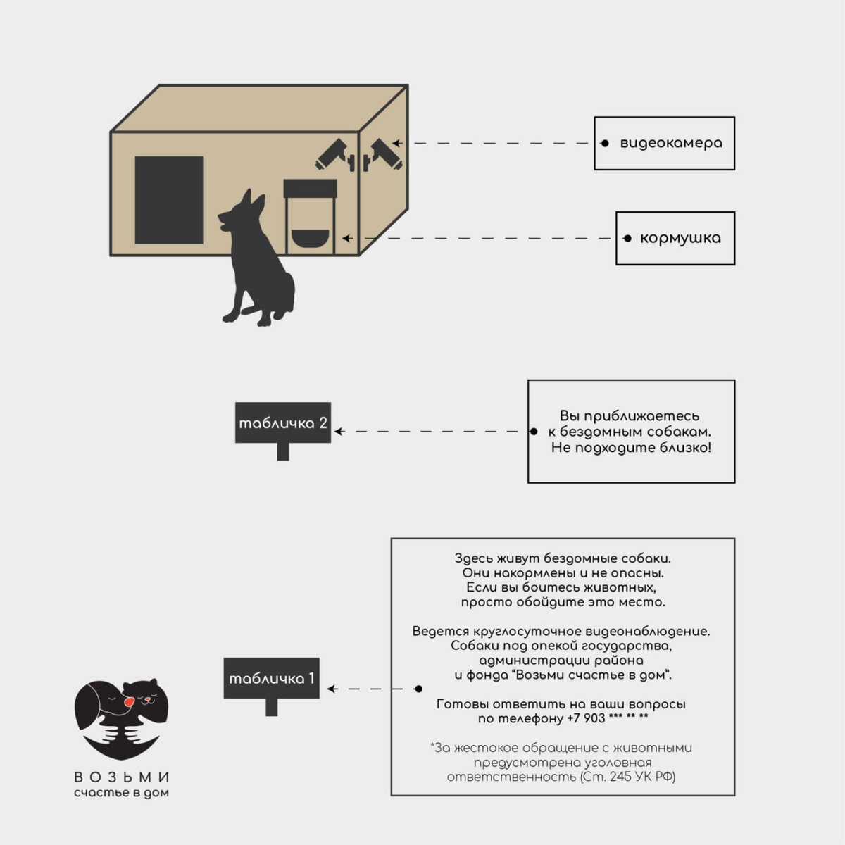 Сами домики представляют собой простую будку из дерева с лазейками, обшитую утеплителем, с металлической автокормушкой. Съемная крыша дает защиту от осадков и солнечных лучей, а также обеспечивает простой доступ внутрь для уборки. Снаружи каждого домика — небольшая стационарная видеокамера, позволяющая контролировать работу кормушки и следить за поведением собак на поднадзорных территориях. Домики обрабатываются безопасным для животных антисептиком, который позволяет продлить срок эксплуатации обшивки. У входа на территорию с домиками расположены две предупреждающие таблички с информацией о проекте и его подопечных. Сейчас этот проект реализует фонд «Возьми счастье в дом».