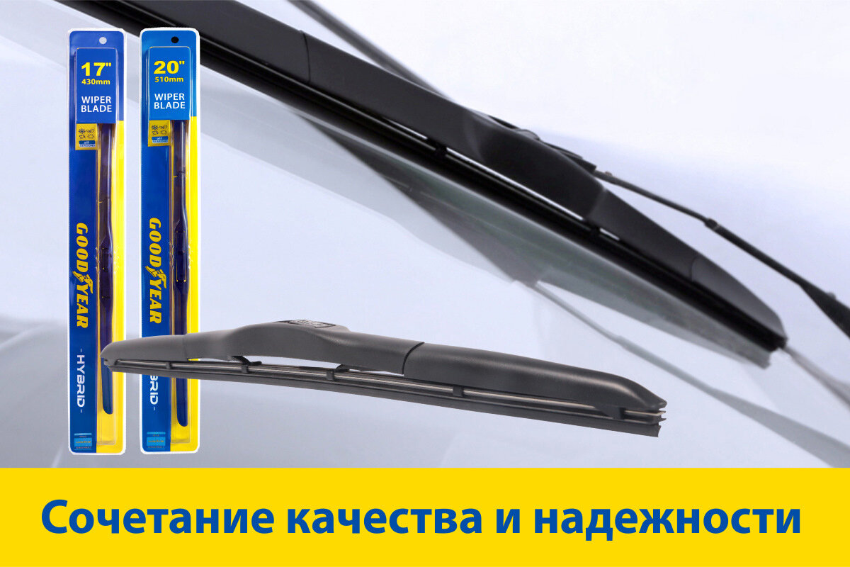 Основная задача дворников – качественно очищать лобовое стекло, что обеспечить водителю хороший обзор. Однако это не единственный критерий, на который обращают внимание автолюбители при выборе новых щеток. Многим хочется, чтобы их дворники были универсальными, долговечными и ни в коем случае не портили внешний вид автомобиля. Всем этим запросам отвечают гибридные щетки стеклоочистителя, которые гармонично сочетают в себе лучшие качества каркасных и бескаркасных. Впервые такую конструкцию дворников начали применять японские автопроизводители. Изначально гибридные щетки устанавливали на машины премиального класса, но сегодня они доступны уже всем автолюбителям. Главный рабочий элемент гибридной щетки – это резиновое лезвие. Лезвие дворников Goodyear «Hybrid» изготавливают из высококачественной резины класса ААА. Оно прекрасно справляется с задачей очистки лобового стекла от воды, грязи и снега в любых погодных условиях. От каркасников гибридным щеткам досталась система коромысел и шарнир