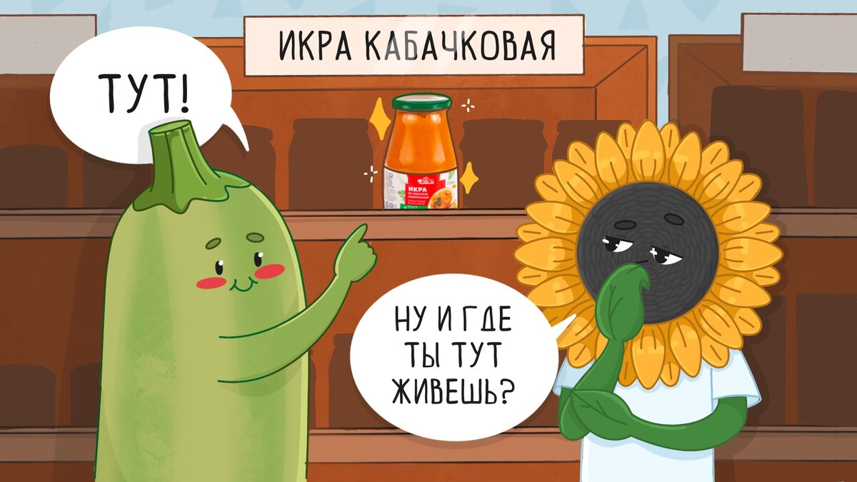 Как-то раз Подсолнух увидел на полке магазина кабачковую икру и сразу вспомнил вкус детства. Когда-то он обожал намазывать ее на ломтик ароматного черного хлеба — это был его любимый перекус. Недолго думая, Подсолнух поставил в корзину несколько баночек. Он принял решение продегустировать разные экземпляры, и лучший принять в клуб качественных продуктов «Качество в подарок». Ему очень хотелось поделиться этим вкусным и полезным лакомством с другими. Как изготавливают качественную кабачковую икру? Технология изготовления такая: кабачки поступают на производство и первым делом отправляются принимать ванны, чтобы очиститься от загрязнений и бактерий. Затем их протирают и уваривают, а потом отправляют в цех, где смешивают с остальными ингредиентами. В последнюю очередь добавляют сахар и соль. Готовую икру закатывают в стерилизованные банки. Каждая партия обязательно проходит контроль качества на вкус, цвет, запах, а также микробиологические показатели, которые подтверждают, что микрооргани