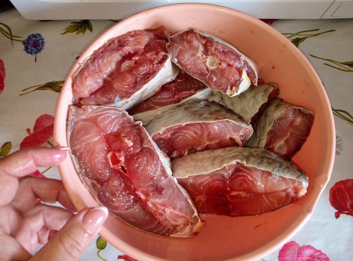 Ехала сегодня с анализов голодная. Сдавала натощак кровь. И припозднилась. Сдала только в 12 дня. Пока домой доехала было уже 13 часов. Пока же ехала в автобусе мозг издевался надо мной и в мысли подкидывал мне образы вкусной рыбы в разных видах приготовления. Выйдя на остановке я чуть было уже с голода не купила леща горячего копчения... Но всё же удержалась. Взяла свежего сазана. И поплелась домой его готовить. Здравствуйте! Блог о повседневной жизни. О том, как я меняю себя, своё тело и своё отношение к жизни. Жила до 44 лет словно понарошку, теперь хочу жить по-настоящему. Поддержите в комментариях и подпиской на канал нажав СЮДА - это придаст мне сил и веры в успех! Присоединяйтесь ко мне кто хочет тоже изменить свою жизнь, будем меняться вместе, друг друга поддерживать, подбадривать и у нас всё получится! Получится снова научиться любить себя, свою жизнь и радоваться каждому дню! Брала две тушки с хвостовой части. Чищенного. Целого если брать он просто огромный был в продаже. И