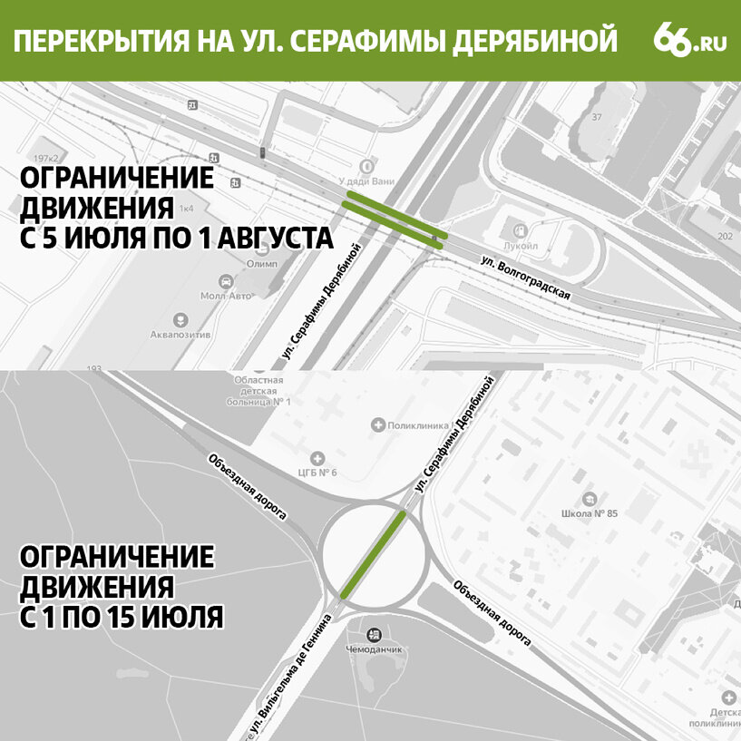 - С 1 по 15 июля — по пересечению Серафимы Дерябиной и Объездной автодороги. Автомобилисты смогут объехать зону перекрытия по транспортному кольцу;