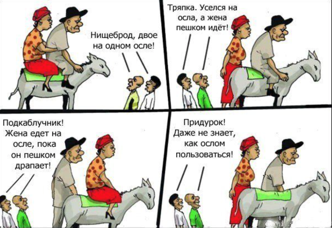 Картинка попалась любопытная про ослика. В нем всё дело. Не было бы ослика, не было бы и проблемы. Но однажды ослик все же появился в семье одного небогатого мужика. И, сам того не подозревая, стал источником неприятностей. Ослика купил мужик на радость себе и жене как помощника по хозяйству. Но что получилось? Были в той истории еще два мужика. Думается мне, что они были соседями нашего мужика с осликом. Им нечем было особо себя занять, вот они и придумали выходить на улицу и каждый раз наблюдать за тем, что же выкинет мужик с осликом на этот раз. И если бы они только наблюдали. Так ведь нет, они комментировали увиденное. Старались они это делать придирчиво, критично, с особой злобой, оскорблениями и насмешками. Вот, посмотрите сами 👇. Как бы ни вышел мужик проехаться на ослике, эти двое тут как тут, устроились и судачат. И вот что остается делать несчастному мужику? Ведь судя по смене сюжетов, выкрики - то он этих злодеев прекрасно слышал. Иначе бы у него не возникало идеи что-то ме