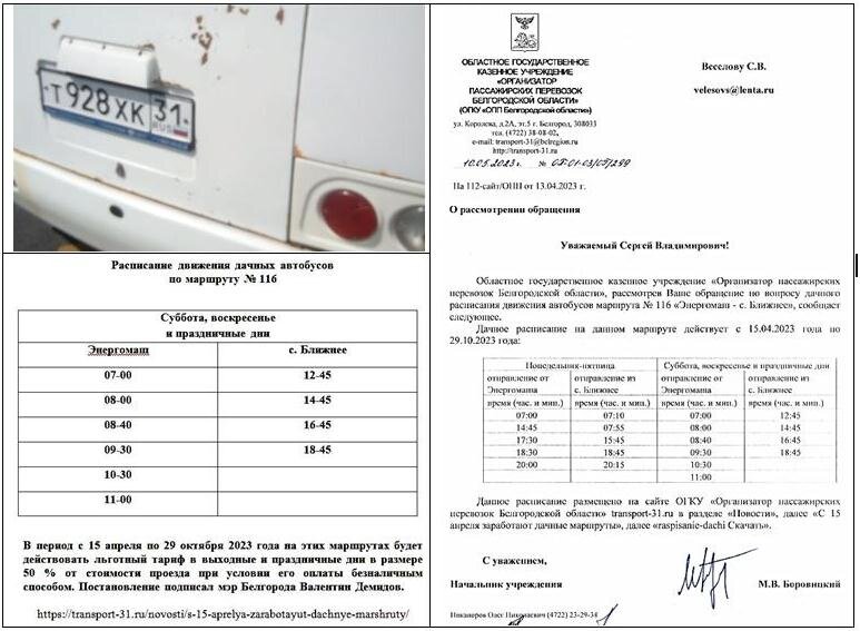 Когда же нормальный человек наконец– то сможет вздохнуть – облегчённо? А не опять – обречённо … И это «облегчённо» – в нормальном смысле. В том, что перестал существовать жутко надоевший буквально всем, этот – идиотизм. Захапать, урвать … Ведь индивид, у которого напрочь отсутствуют нормальные человеческие качества, например, Совесть – разве, извините, может ли быть Человеком? Если важнейшее, определяющее свойство Человека – отсутствует? Ответ очевиден. Вот 24 июня сего года водитель автобуса, номер Т 928 ХК 31 RUS, маршрут 116, с выездом из с. Ближнее в 1445 (см. фото), со всех «дачных» (льготных, 50 % от полной стоимости проезда) пассажиров, севших в автобус на остановке «Родник», потребовал и взял (кроме меня) – полную оплату за проезд. Несмотря на то, что ему было предъявлено фото документа (см. фото), указывающего на то, что данный рейс – льготный для «дачников». Взял, мотивируя тем, что владелец данного автобуса о наличии льгот не сказал ни слова. Хотя оба они, и «хозяин», и води