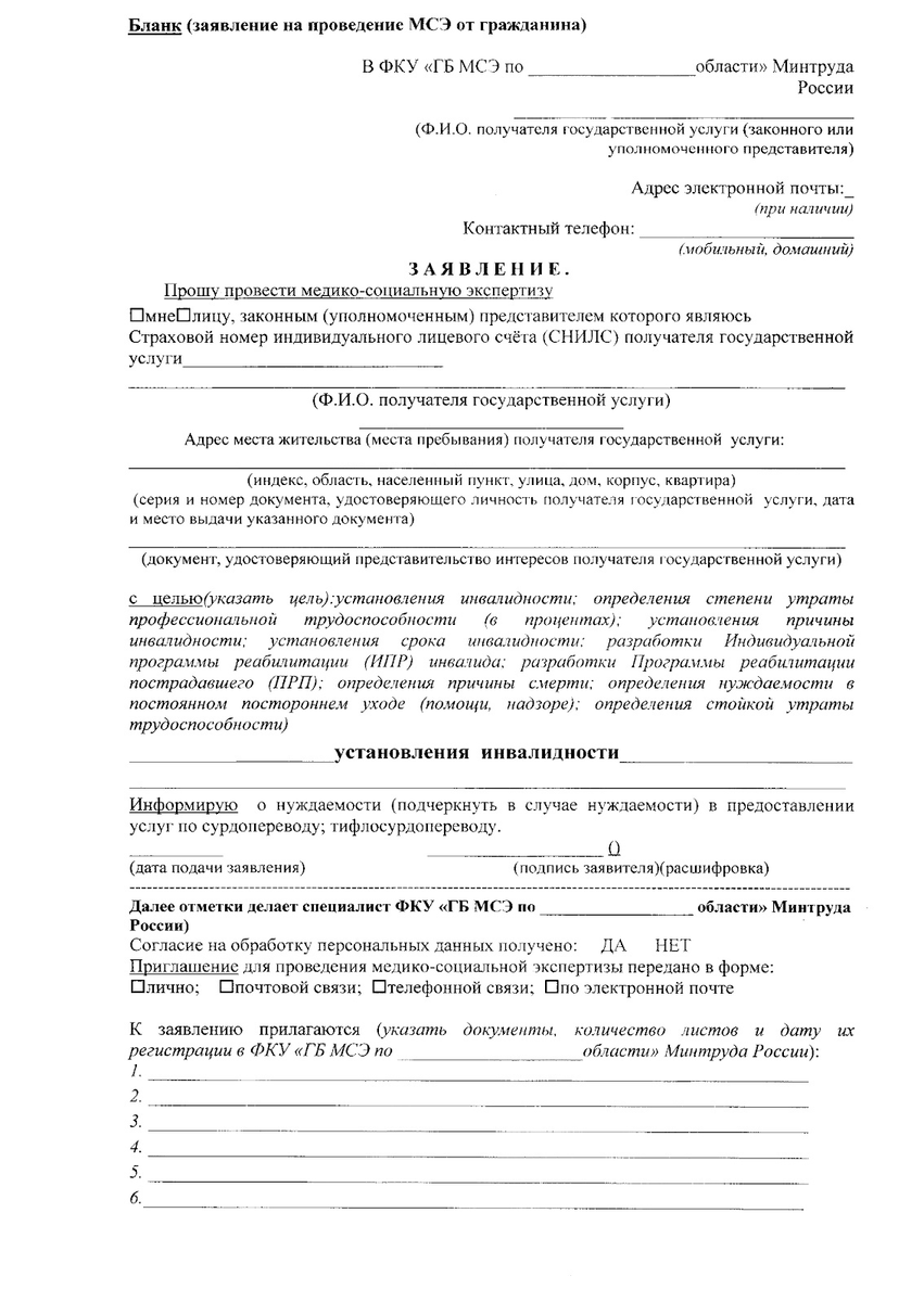 Заявление на участие в медико-социальной экспертизе подается лицом, претендующим на установление инвалидности. МСЭ рассмотрит ваше заявление и прилагаемые к нему документы и определит степень нарушения состояния вашего здоровья, способность к труду и необходимые для реабилитации технические средства и протезно-ортопедические изделия.