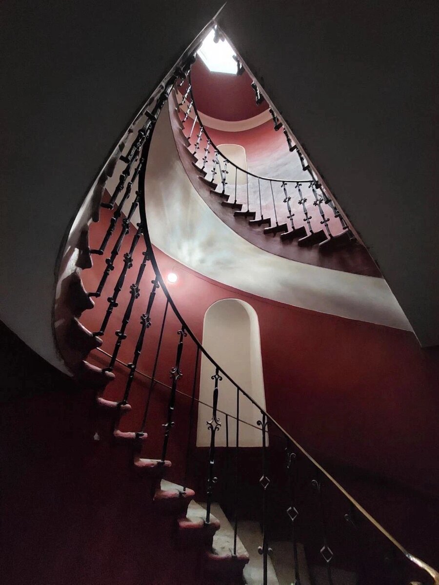 Снаружи это здание имеет достаточно простое оформление, но впечатление о нем мгновенно меняется, когда попадаешь внутрь. Там можно увидеть великолепную закрученную лестницу с кованым ограждение, украшенным ромбовидными узорами. Наверху, в центре находится зенитное окно, которое обеспечивает естественное освещение.